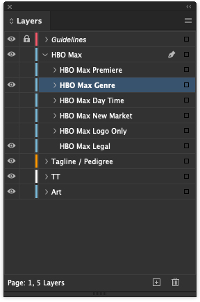 Tune-in configurations are built into the template and can be found in the HBO Max layers in Photoshop and InDesign. See below to locate the appropriate layers based on use case. For copy guidance, refer to the “Tune-In Formatting” section that follows.