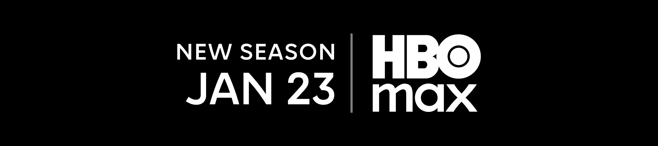 - Genre indicator and tune-in date: Use the brand attribution color, such as pure white (see above). However, use the tagline color when the title treatment and HBO Max logo are in white (see The Last of Us).